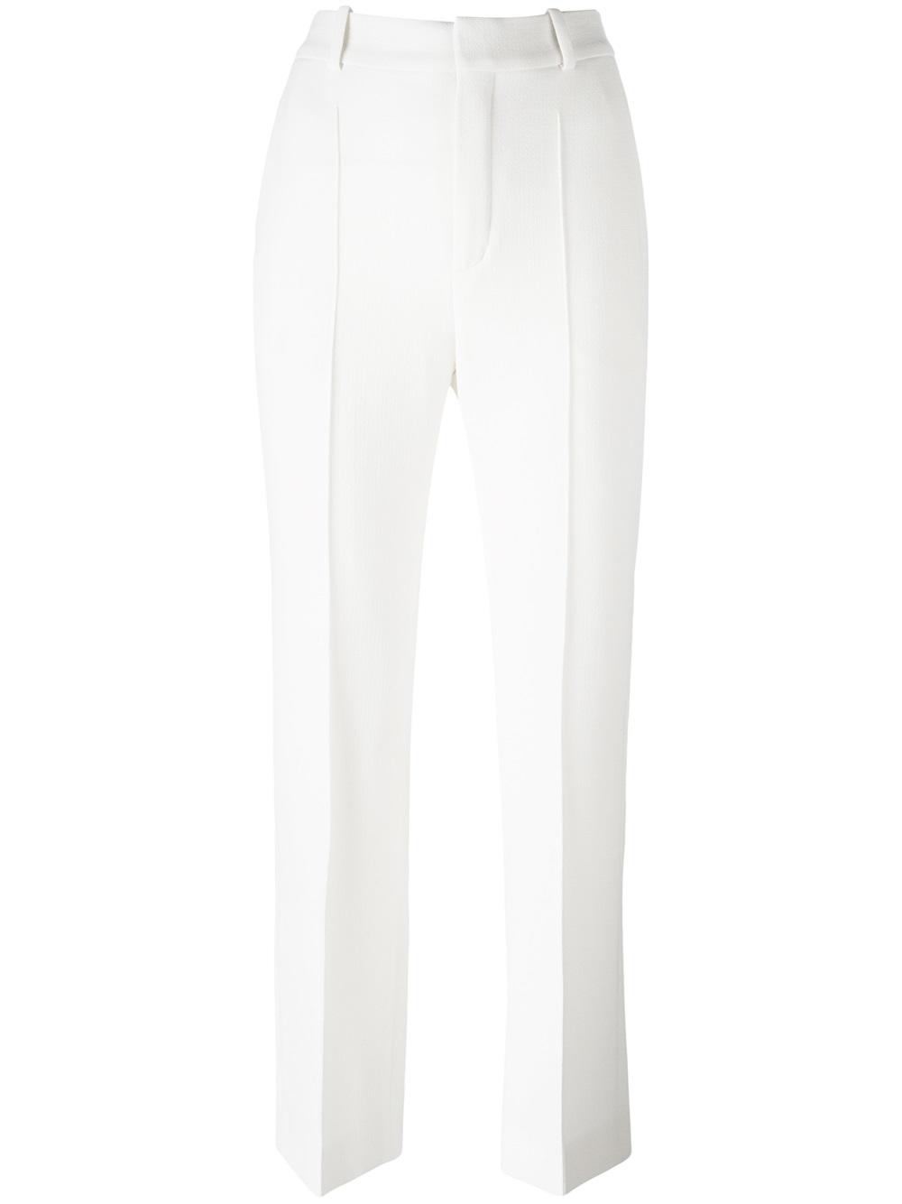 - These straight leg Chloé trousers capture the tailoring style codes of the maison. Fabricated from an ivory wool-silk blend these slim fit trousers are a must-have for any Chloé girl. Designed with timeless appeal in mind, they feature a discreet concealed front fastening, belt loops, pressed creases, two inset pockets to the sides, a regular length and a back welt pocket. Wear with a blush toned jumper in keeping with Chloé's signature colour palette.