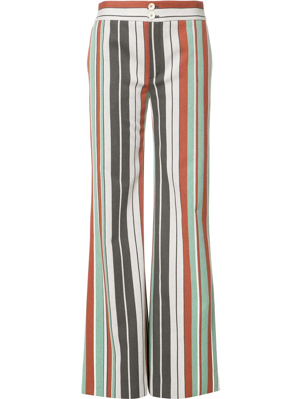 - Sea green, brick red and slate grey cotton blend striped flared trousers from Chloé featuring a front button fastening, a zip fly, two inset pockets to the sides, a back welt detail and a regular length.