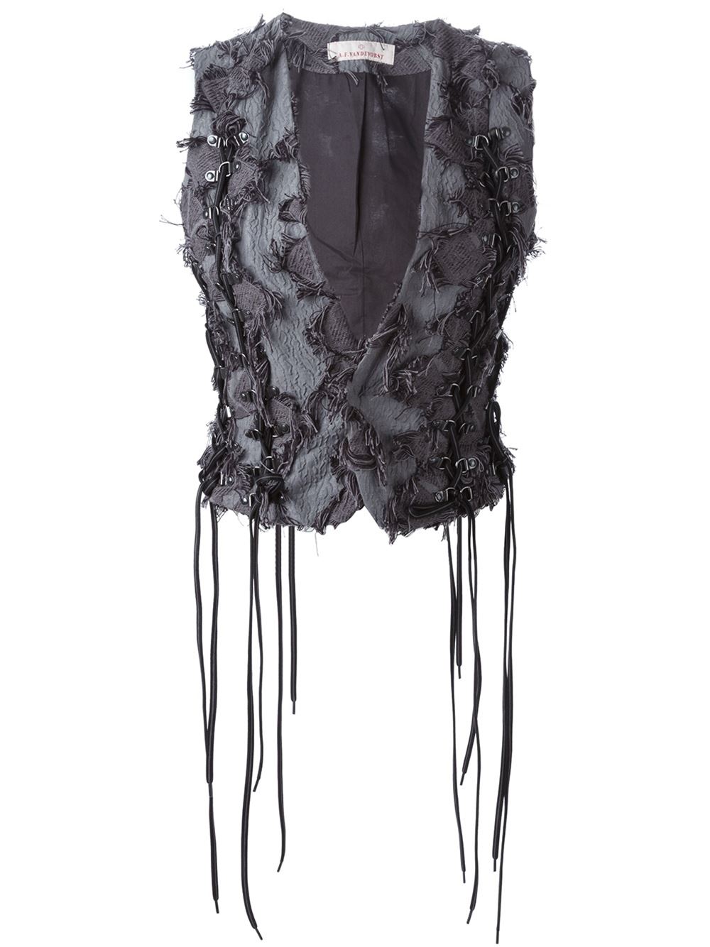 - A.F.Vandevorst 灰色 棉丝混纺 '152 Graphic'马甲。 V领, 无袖设计, 隐藏式开合, 蕾丝细节, 流苏设计。