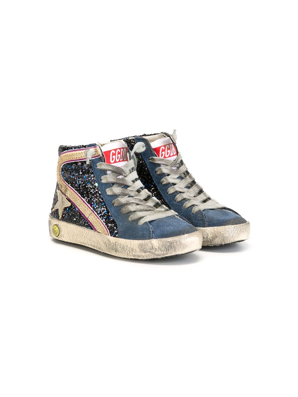 - GOLDEN GOOSE DELUXE BRAND KIDS 蓝色 牛皮与全棉 'Slide'高帮板鞋。 金葱胶细节, 仿旧效果, 正面绑带, 圆头, 平底橡胶鞋底。