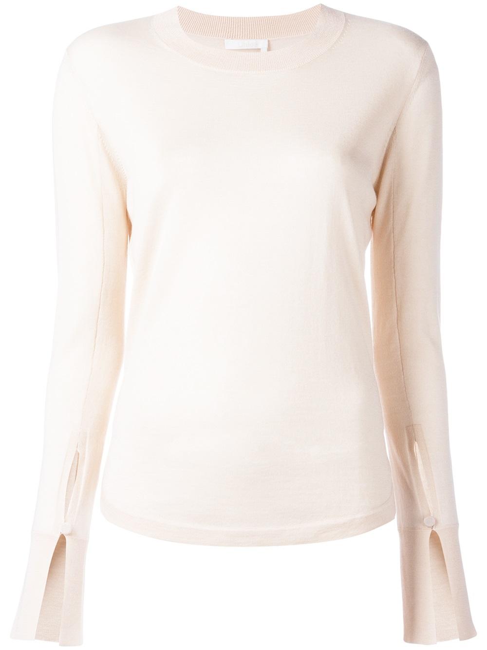 - Nobody does soft femininity quite like Chloé as showcased in this pinky beige cuff slit jumper. Spun from virgin wool, silk and cashmere, it captures the elegant curved lines and innate air of sophistication synonymous with the maison. With additional open cuffs this super fine Chloé jumper is a fresh update on the perennially chic crew neck knit. Wear with white tailored trousers and sneakers for an understated yet polished look that will stand out against the rest.