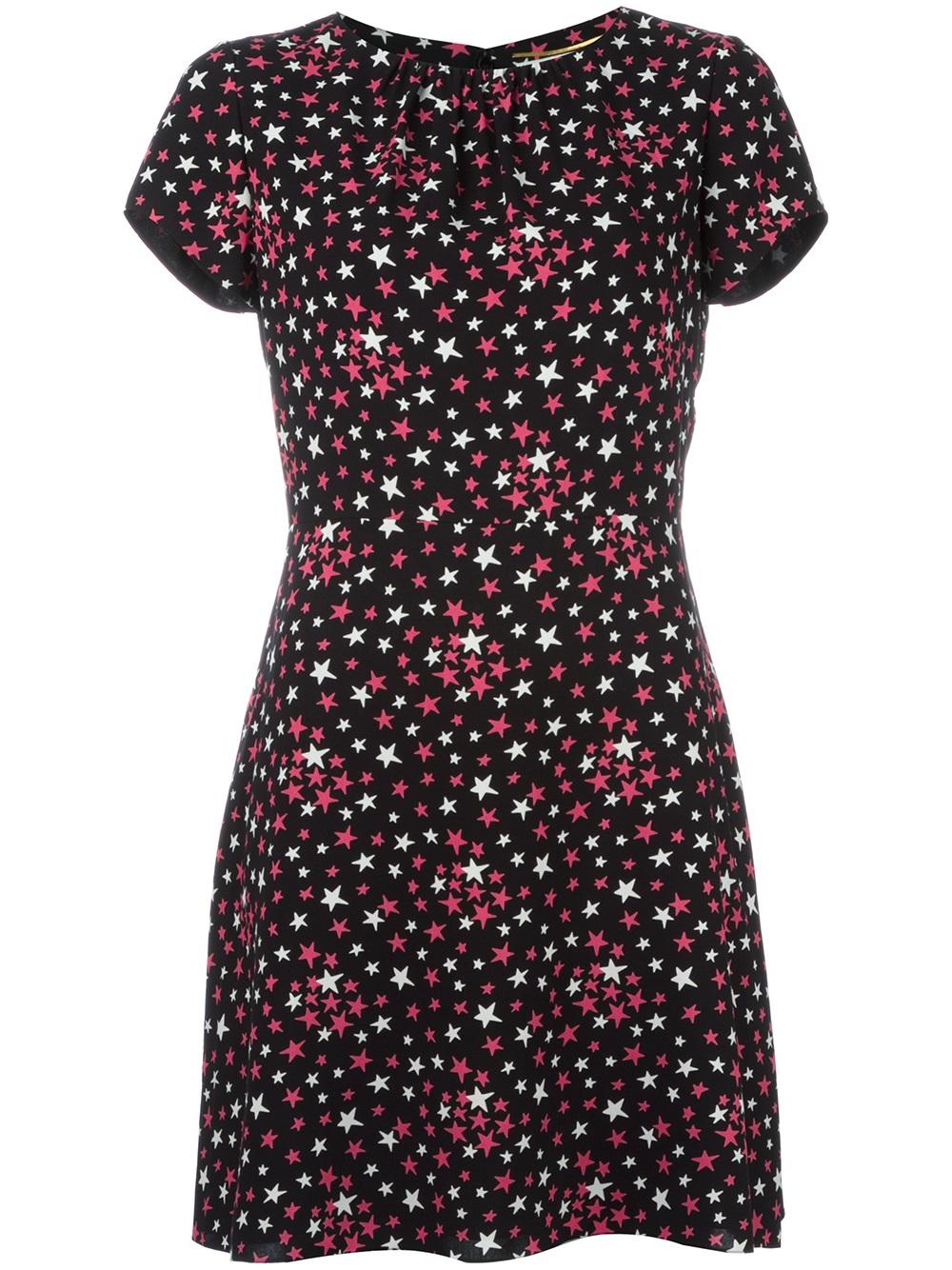 - Black, pink and white silk star print shift dress from Saint Laurent featuring a round neck, short sleeves, a concealed rear zip fastening, a fitted waist, a straight hem and a short length.