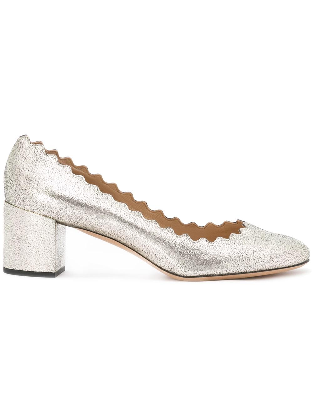 - These Lauren pumps are a must-have for every Chloé fan and suitable for any occasion. Rendered in metallic grey leather, these Lauren pumps from Chloé feature an almond toe, a metallic sheen, scalloped details, a branded insole and a mid high block heel.