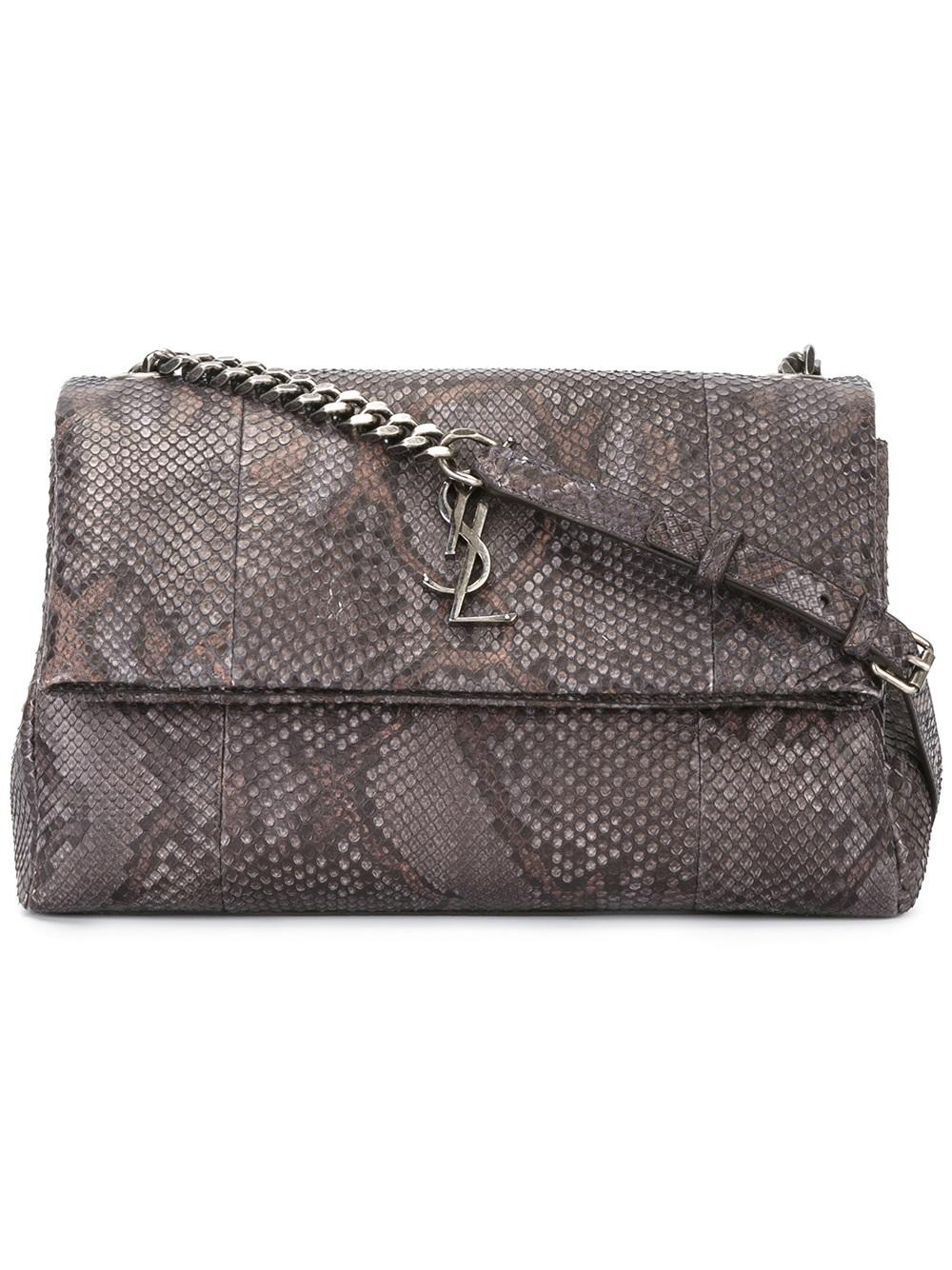 - Grey python skin medium 'West Hollywood' shoulder bag from Saint Laurent featuring an adjustable chain and leather strap, silver-tone hardware, a front logo plaque, a back zip pocket, a foldover top with magnetic closure, a full lining, an interior zipped compartment, an internal slip pocket and an internal logo plaque. Please note that this item cannot be shipped outside the E.U..