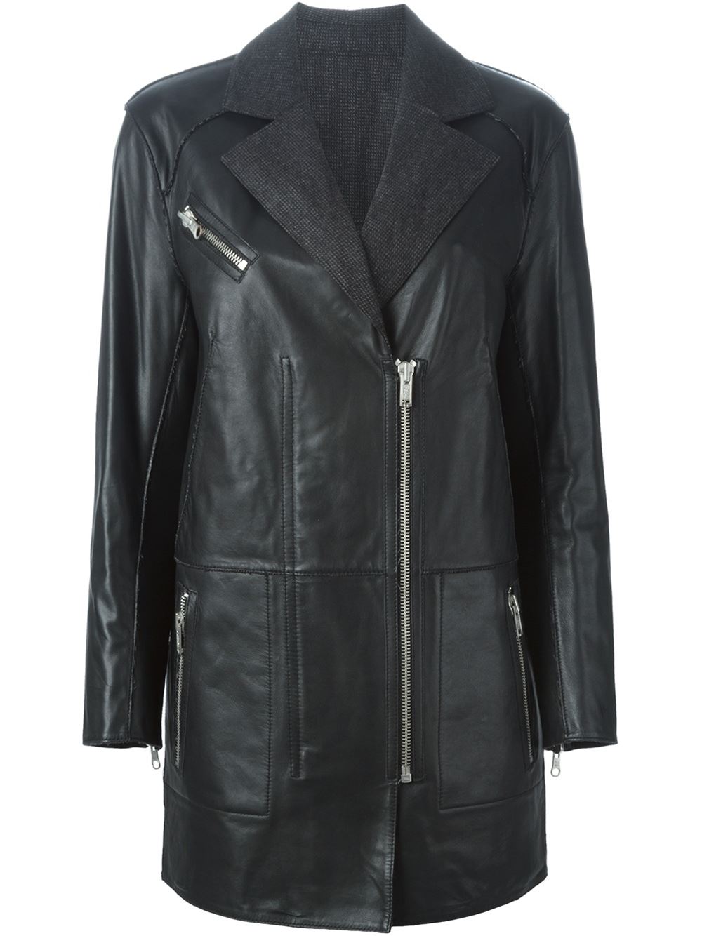 - Muubaa 黑色 小羊皮与羊毛 机车大衣。 梯形翻领, 偏中心正面拉链, 正面拉链口袋, 拉链袖口。