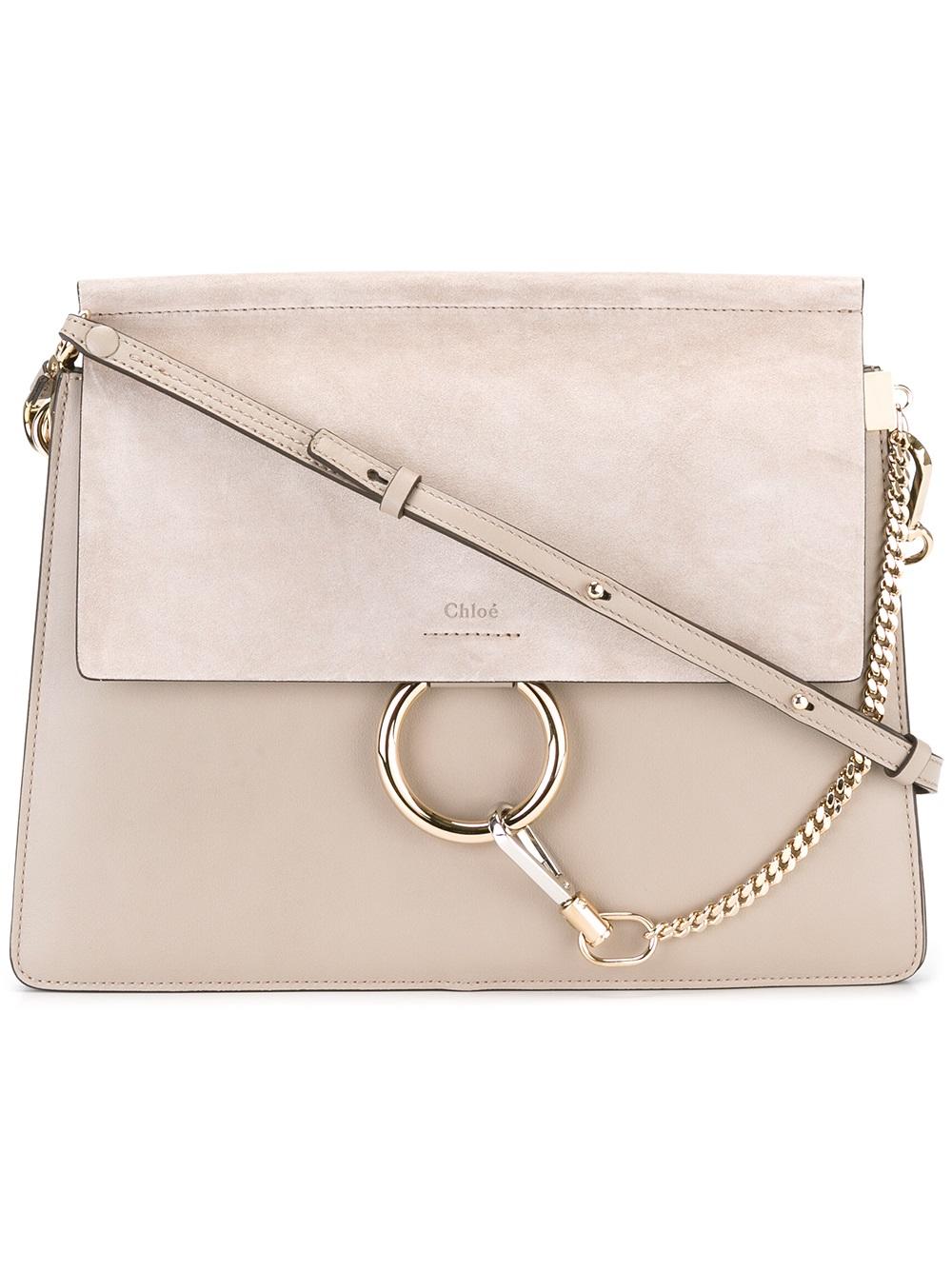 - The Chloé Faye shoulder bag is as iconic as the house itself. Crafted from smooth motty grey calf suede and calf leather with the addition of mixed hardware for a hint of rebellion, this Faye shoulder bag is the epitome of modern femininity. It features a foldover top with a signature hoop and chain closure, a detachable and adjustable shoulder strap, a contrast piped trim, an accordion-style interior, an internal zipped pocket and a calf suede lining.