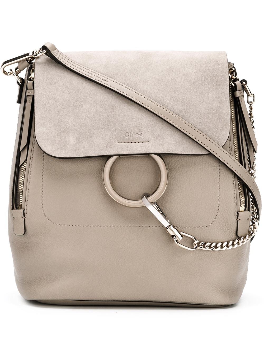 - Chloé (寇依) 灰色 小牛皮 Faye背包。 翻盖饰有插入式的摁扣, 金色五金配件, 正中有品牌标记, 可拆卸肩带, 三角形衬料饰有拉链, 可调整肩带, 棉质衬里, 内置标签, 内置拉链口袋。