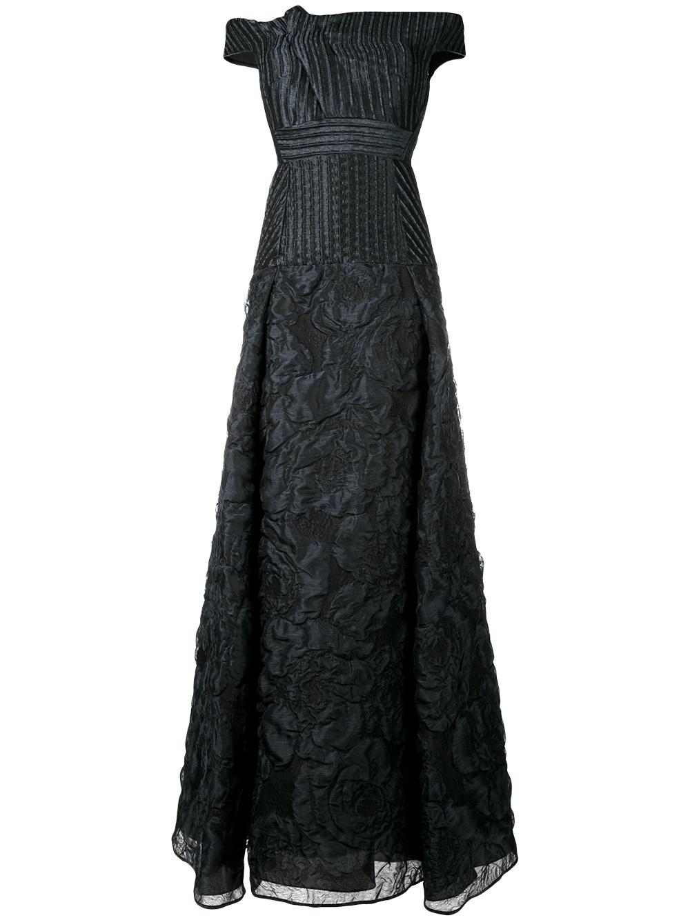 - Blue silk linen-blend Gildon off-shoulder cloque gown from Roland Mouret.