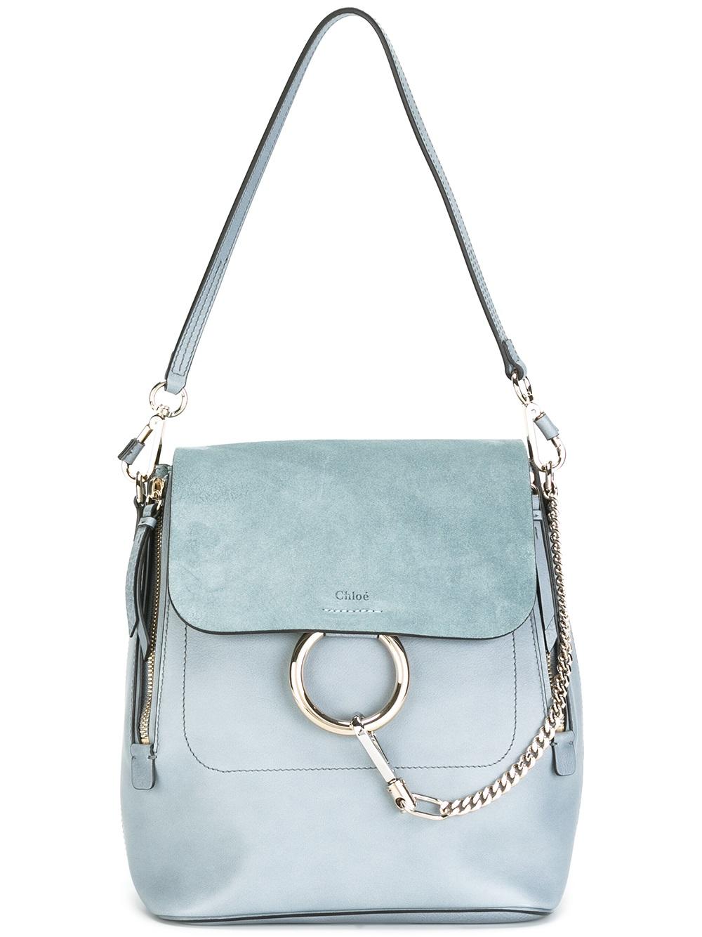 - Chloé (寇依) 蓝色 牛皮 Faye背包。 翻盖饰有插入式的摁扣, 金色五金配件, 三角形衬料饰有拉链, 正中有品牌标记, 可拆卸肩带, 可调整肩带, 棉质衬里, 内置拉链口袋, 内置标签。