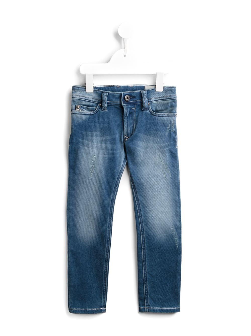 - DIESEL KIDS 蓝色 棉质混纺 仿旧牛仔裤。 腰带袢, 纽扣与拉链开合, 五口袋设计, 磨损细节, 褪色效果, 直筒腿。