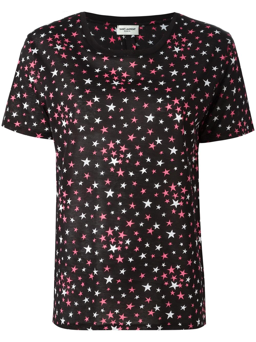 - Saint Laurent (圣罗兰) 黑色与多色 全棉 星星印花T恤。 圆领, 短袖, 大面积花纹, 平直下摆。