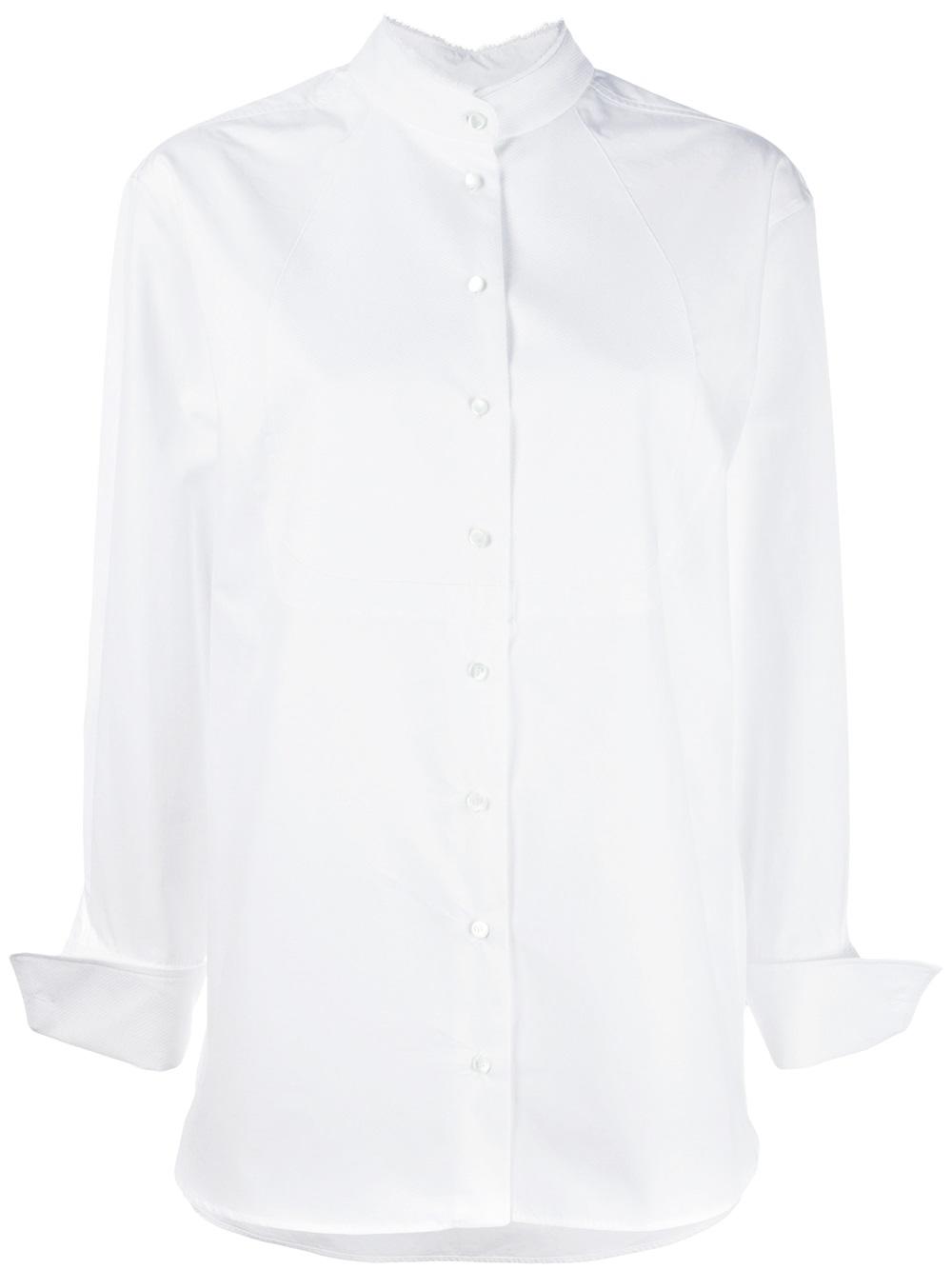 - The Chloé collection combines Brit-girl cool with Parisian glamour. This optic white cotton stand up collar shirt from Chloé featuring a front button fastening, frayed edges, a bib to the chest, long sleeves, button cuffs, a curved hem and a box pleat detail to the back.