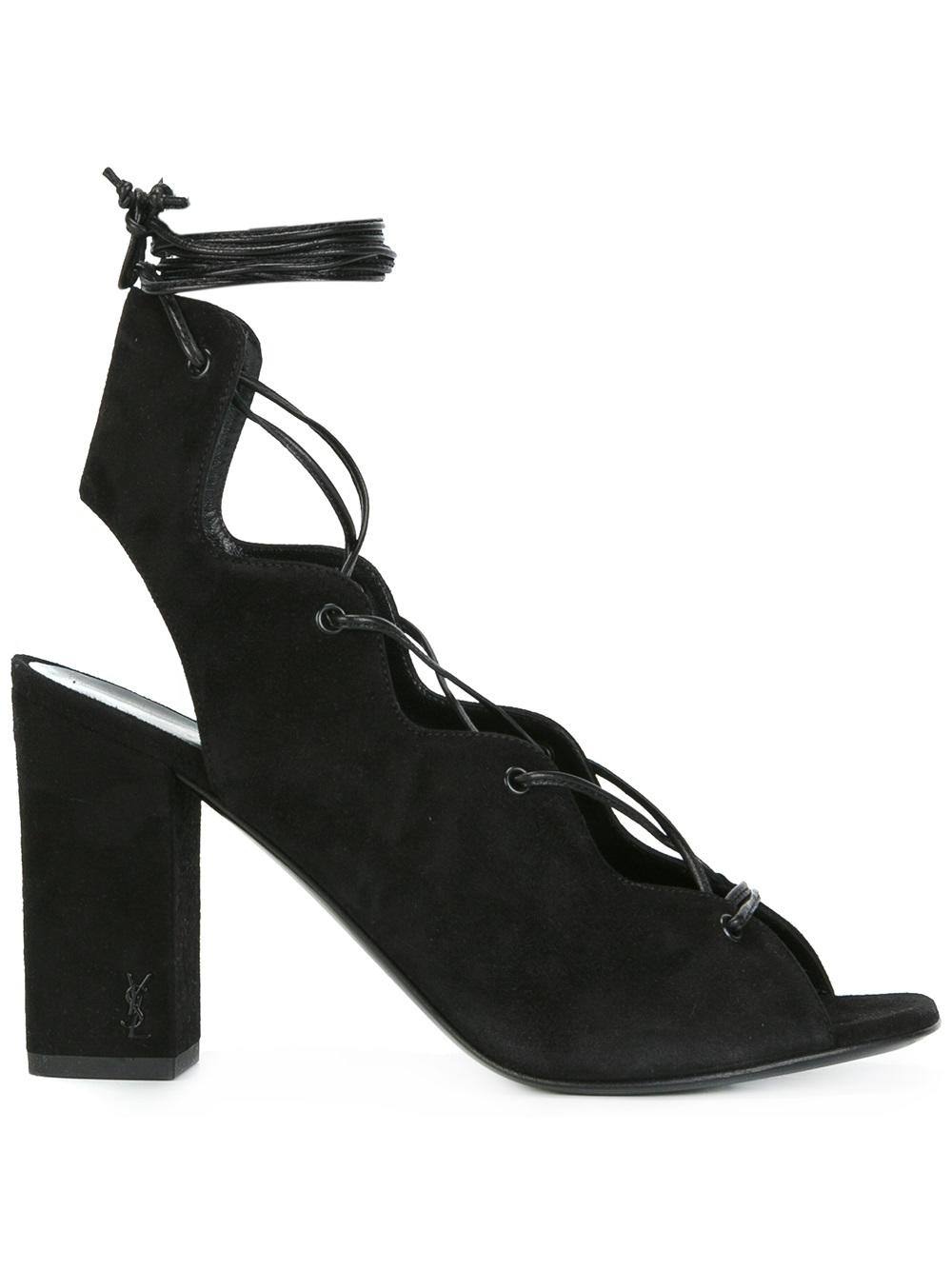 - Under the creative direction of newly appointed Anthony Vaccarello, Saint Laurent’s SS17 collection continues to showcase the label’s coveted rock n’ roll aesthetic, which remains underpinned with a sleek Parisian edge. These black leather Babies 90 lace-up cage sandals from Saint Laurent feature an open toe, a brand embossed insole, scalloped details, a high block heel, a cut out detail at heel and a YSL interlocking logo to one side.