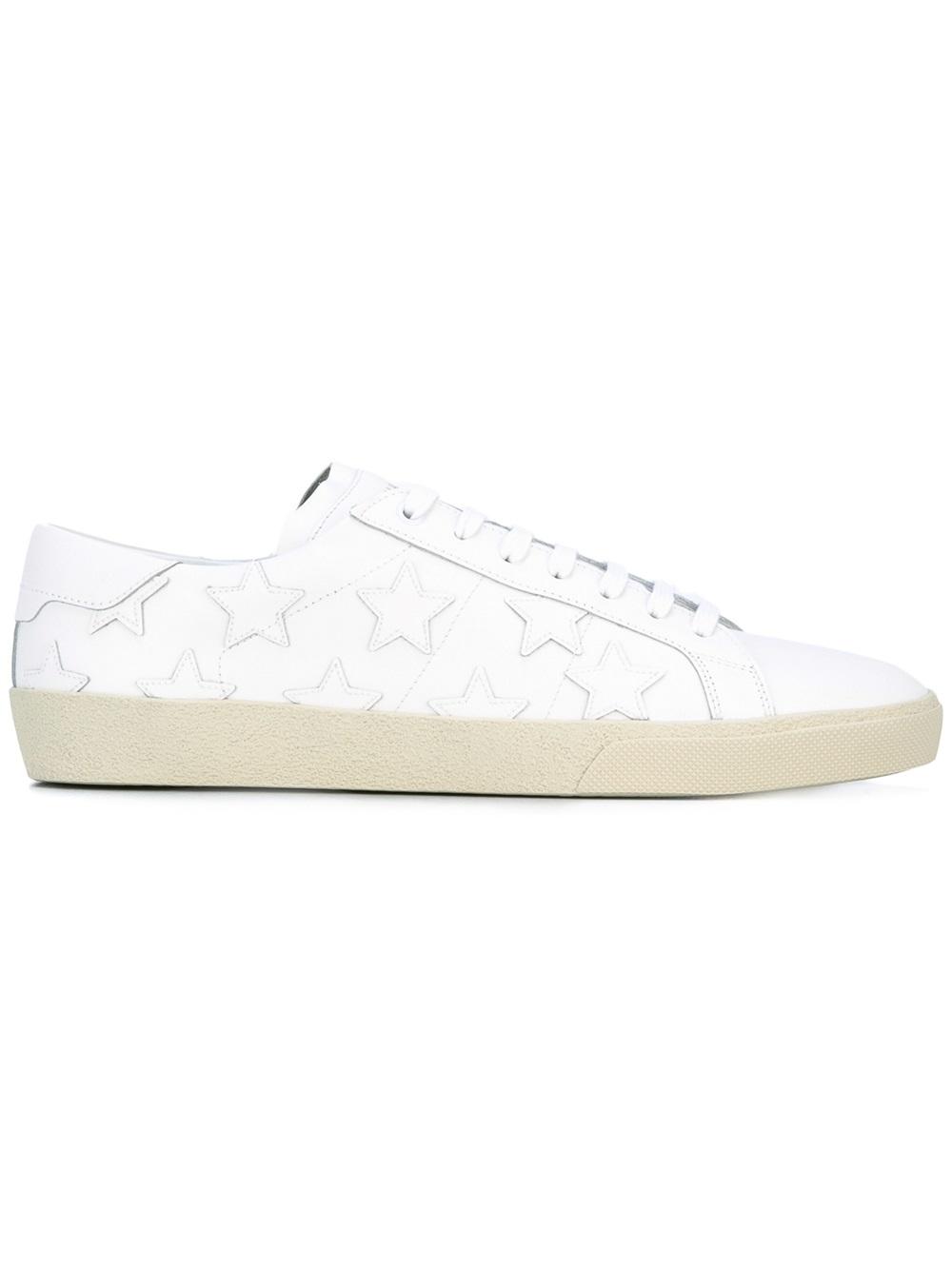 - Saint Laurent’s optic white leather Signature Court Classic sneakers are detailed with subtly eye-catching tonal star patch appliqués and a branded silver heel counter. Part of Hedi Slimane’s California-inspired SS16 collection, these low-top Saint Laurent sneakers are perfect for amping up relaxed off-duty looks. This item fits large, please select half a size down.