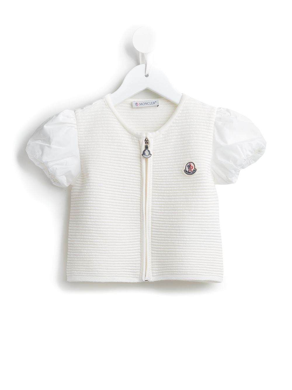 - MONCLER KIDS 白色 拉链上衣。 圆领, 短袖, 胸处饰有标志, 罗纹设计。