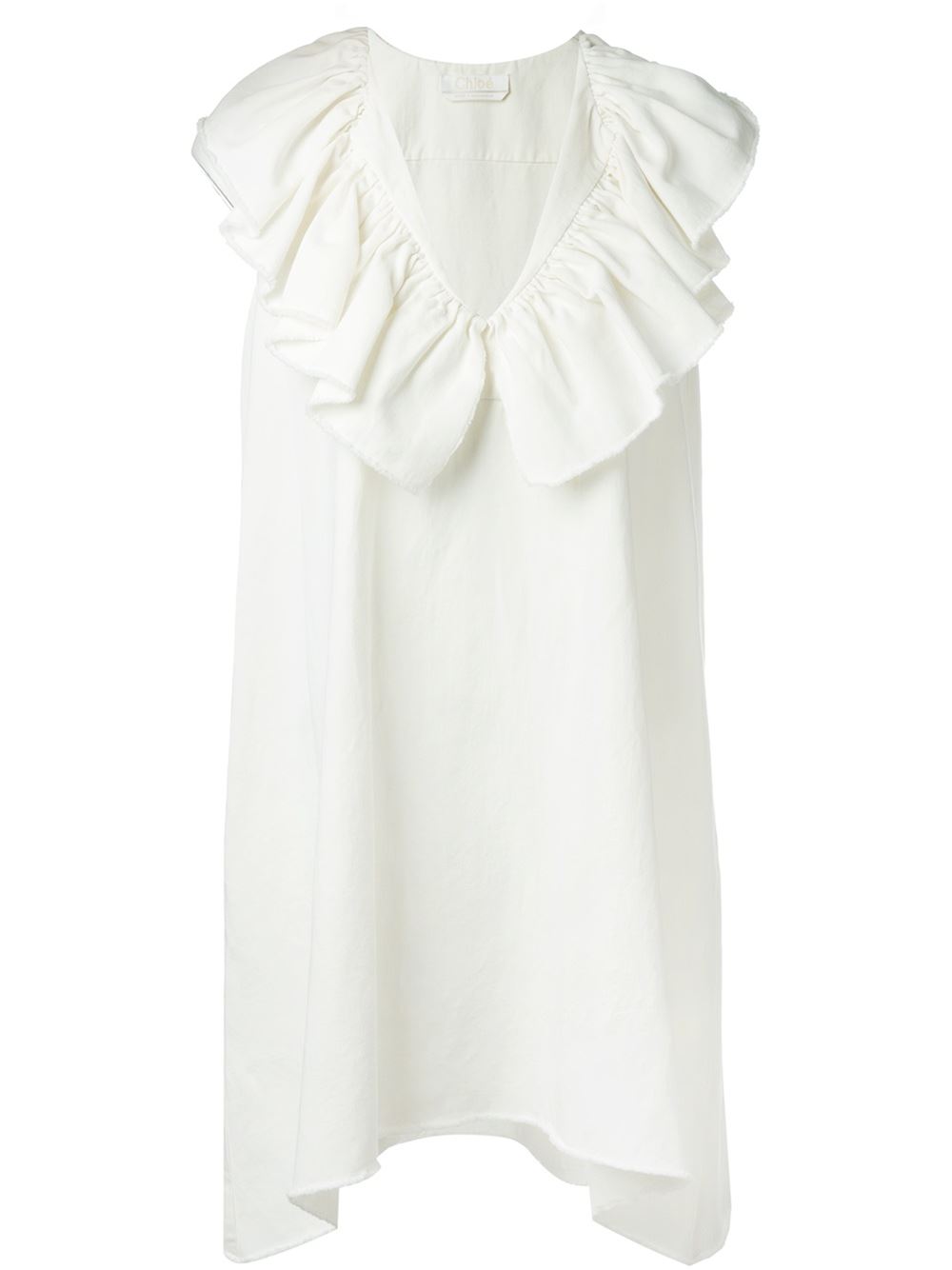 - Chloé 牛奶白色 棉质与亚麻混纺 荷叶领连衣裙。 V领, 宽松, 伞状设计, 磨损边, 无袖设计, 长度不对称。