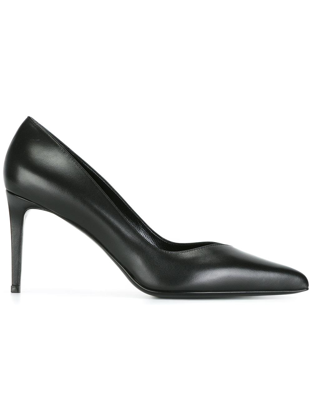 - Under the creative direction of newly appointed Anthony Vaccarello, Saint Laurent’s SS17 collection continues to showcase the label’s coveted rock n’ roll aesthetic, which remains underpinned with a sleek Parisian edge. These black leather and kid leather Classic Paris Skinny 80 pumps from Saint Laurent feature a pointed toe, a brand embossed insole, a slip-on style, a mid high stiletto heel and a v-shaped vamp.