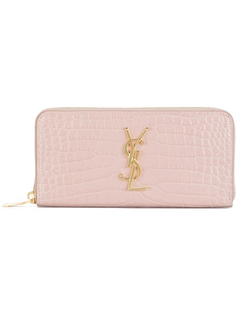 - Under the creative direction of newly appointed Anthony Vaccarello, Saint Laurent’s SS17 collection continues to showcase the label’s coveted rock n’ roll aesthetic, which remains underpinned with a sleek Parisian edge. This pale pink calf leather Monogram zip around wallet from Saint Laurent features a front logo plaque, gold-tone hardware, an embossed crocodile effect, an all around zip fastening, an internal logo stamp, an interior zipped compartment, multiple interior card slots and two open top compartments.