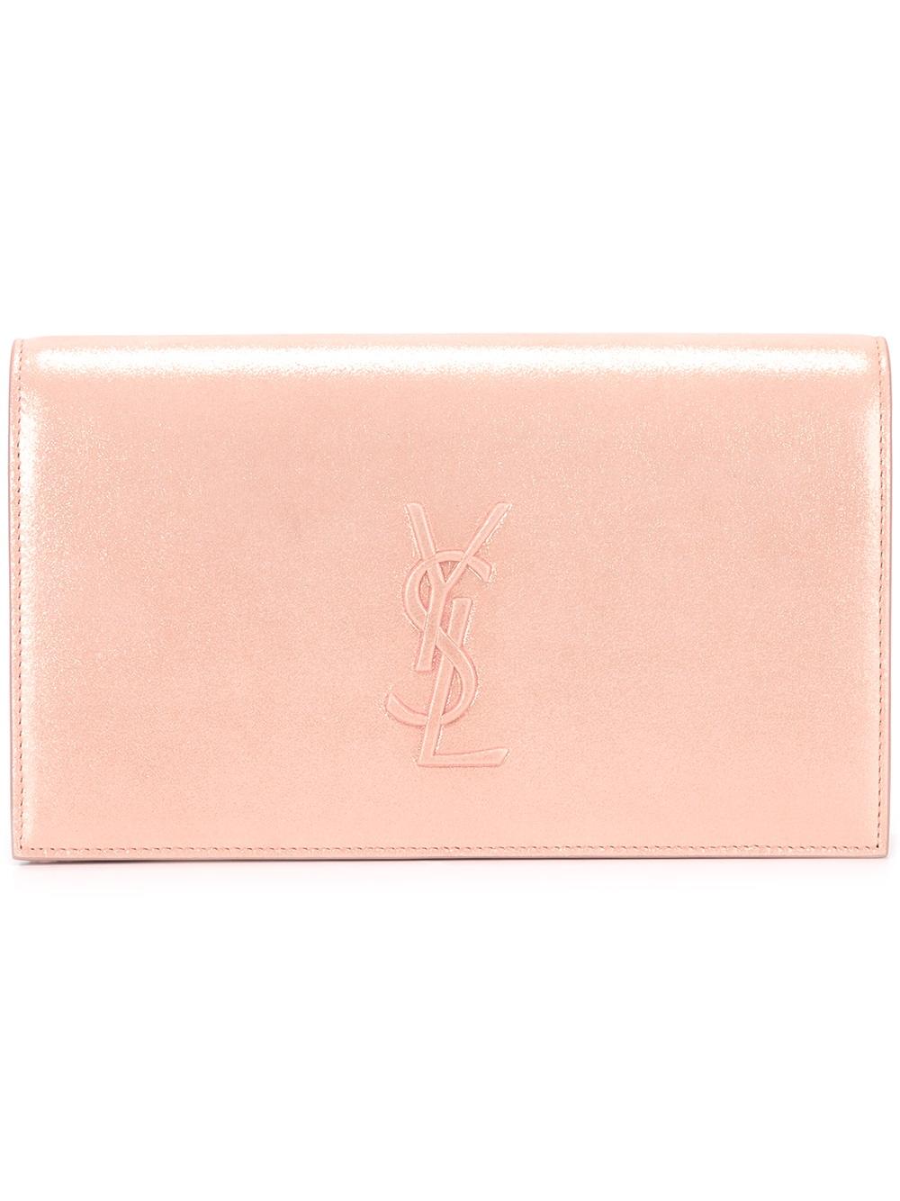 - Under the creative direction of newly appointed Anthony Vaccarello, Saint Laurent’s SS17 collection continues to showcase the label’s coveted rock n’ roll aesthetic, which remains underpinned with a sleek Parisian edge. This pink calf leather classic Monogram clutch from Saint Laurent features a front logo plaque, a foldover top with magnetic closure, a full lining, an internal slip pocket and an internal logo plaque.