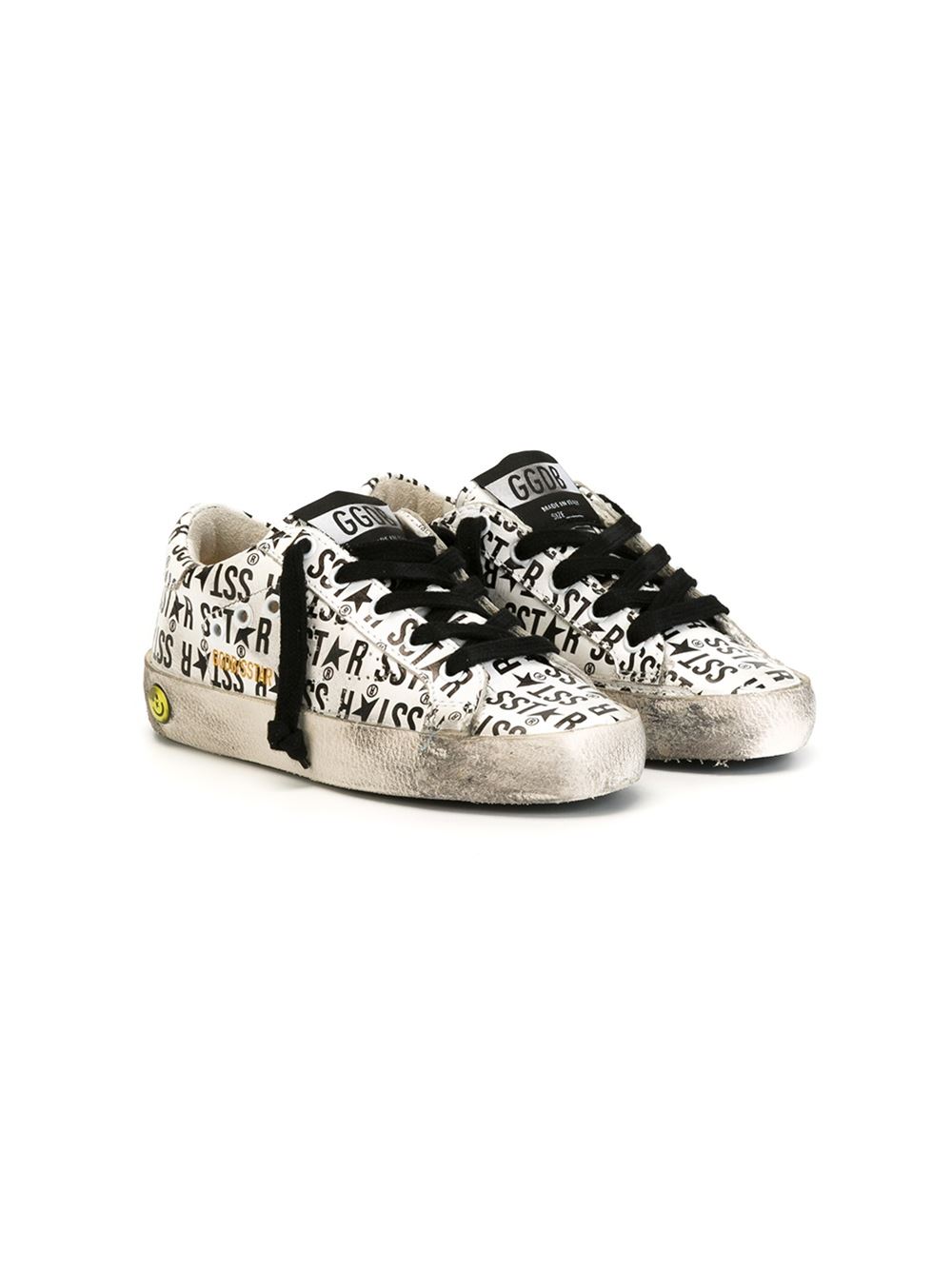 - GOLDEN GOOSE DELUXE BRAND KIDS 白色与黑色 牛皮 标志印花板鞋。 正面绑带, 仿旧效果, 圆头, 平底橡胶鞋底。