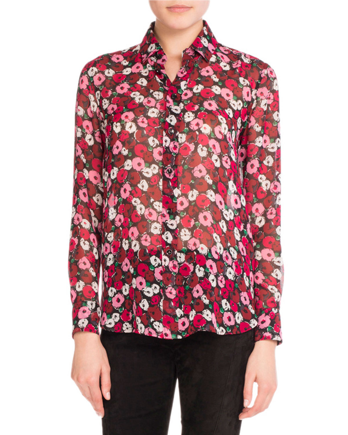Saint Laurent Poppy-Print Classic Silk Blouse, Medium Red