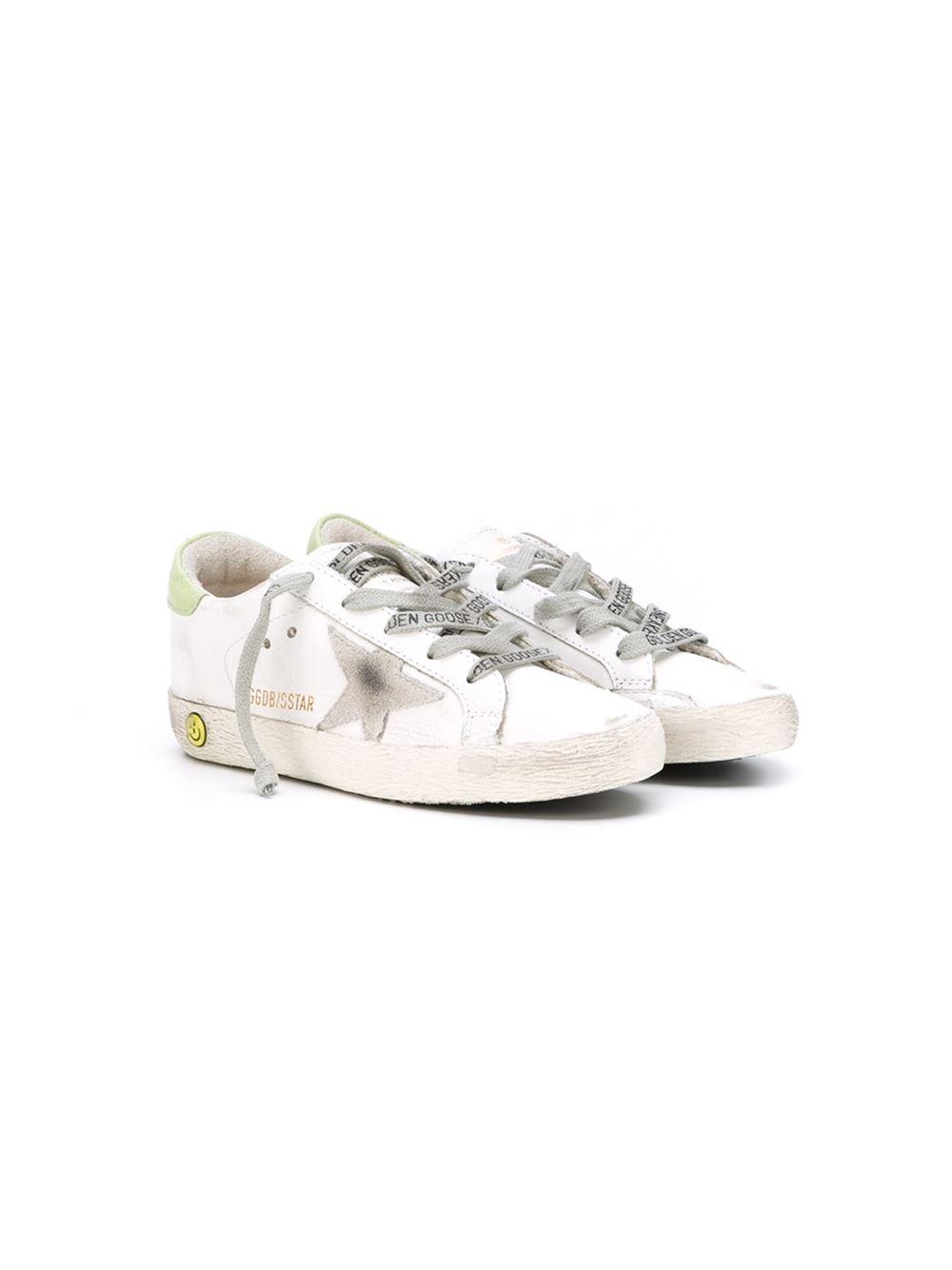 - GOLDEN GOOSE DELUXE BRAND KIDS 白色及灰色 牛皮 'Super Star'运动鞋。 圆头, 正面绑带, 仿旧效果, 平底橡胶鞋底。