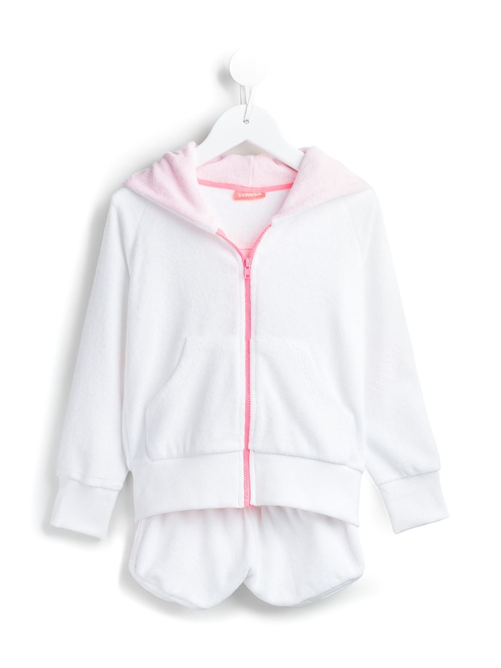 - Sunuva 白色与粉红色 棉质混纺 浴巾式运动套装。 正面拉链, 具有兜帽, 长袖, 贴身袖口。