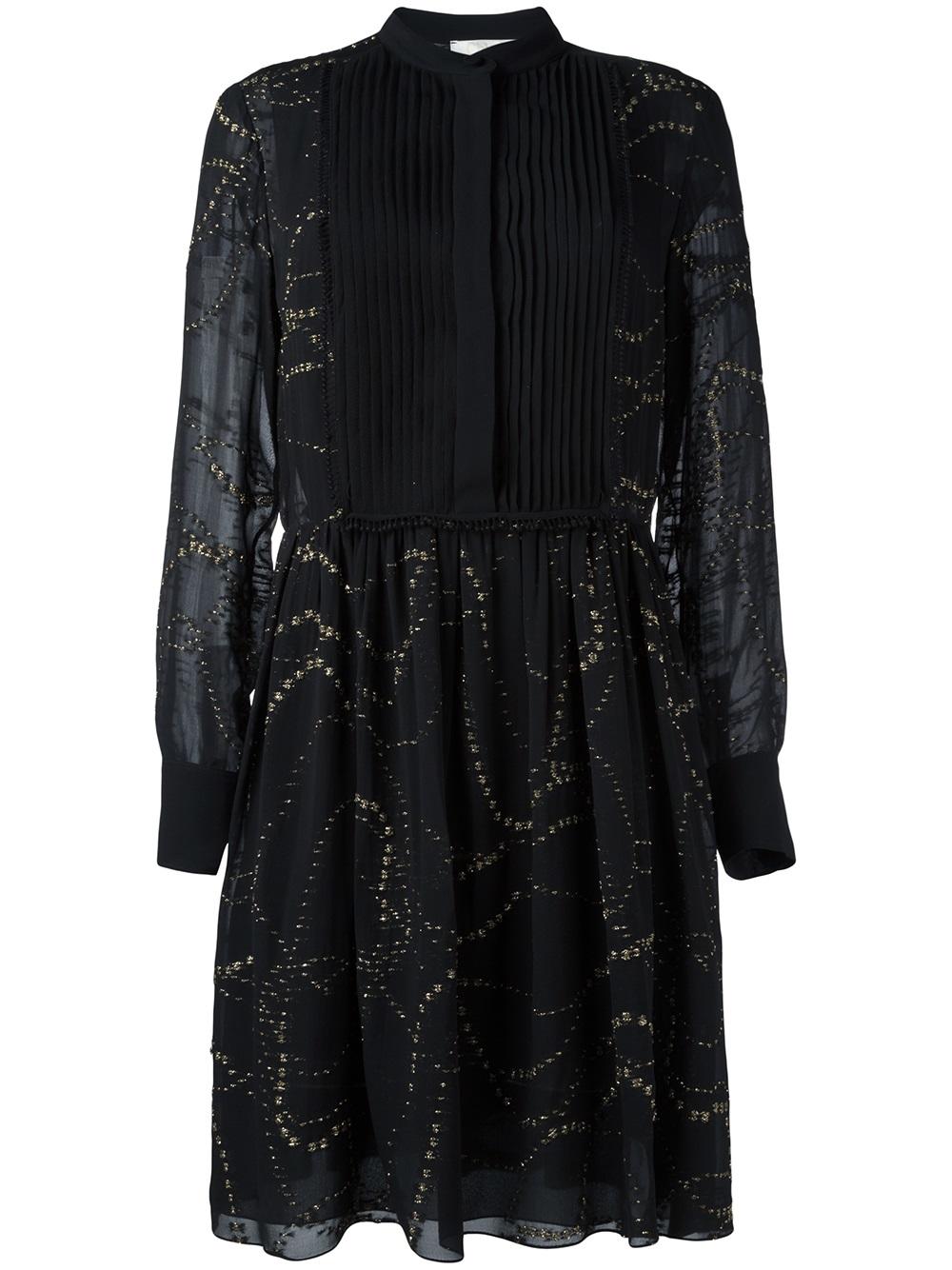 - The Chloé collection combines Brit-girl cool with Parisian glamour. This black silk blend Starry-Sky dress from Chloé features a round neck, a front button placket, a belted waist, metallic threading, a pleated front bib, long sleeves, button cuffs and a mid-length.
