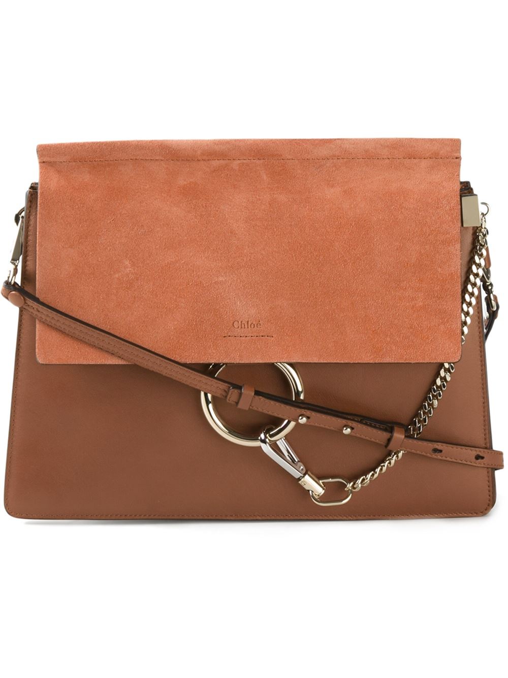 - Chloé 橘色及棕色 绒面皮 'Faye'单肩包。 顶部饰有翻盖, 正中有品牌标记, 银色五金配件, 对比拼接设计, 可拆卸可调肩带, 内置拉链口袋, 内置标签。
