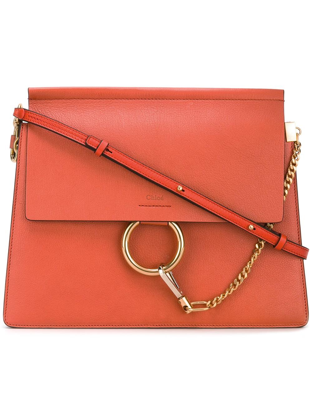 - The Chloé Faye shoulder bag is as iconic as the maison itself. Crafted from smooth sepia red calf leather with the addition of mixed hardware for a hint of rebellion, this Faye shoulder bag is the epitome of modern femininity. It features a foldover top with a signature hoop and chain closure, a detachable and adjustable shoulder strap, a contrast piped trim, an accordion-style interior, an internal zipped pocket and a calf suede lining.