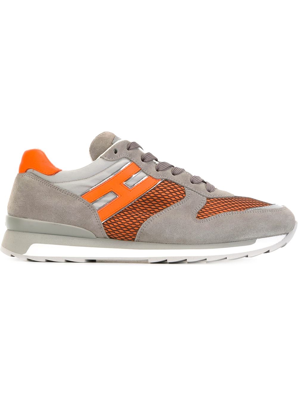 - Hogan Rebel 灰色与橘色 绒面皮 网纱拼接运动鞋。