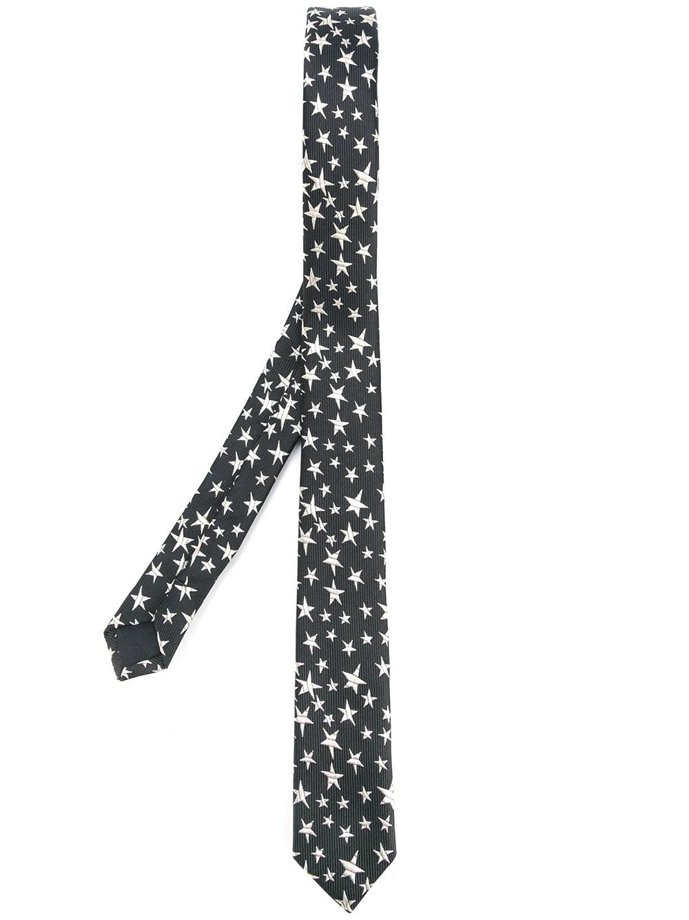 - Under the creative direction of newly appointed Anthony Vaccarello, Saint Laurent’s SS17 collection continues to showcase the label’s coveted rock n’ roll aesthetic, which remains underpinned with a sleek Parisian edge. This black and off white silk jacquard signature star skinny tie from Saint Laurent features a pointed tip and a silver-tone metallic chain loop.