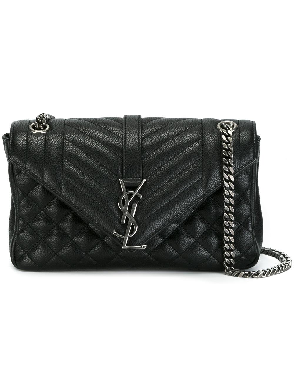 - Under the creative direction of newly appointed Anthony Vaccarello, Saint Laurent’s SS17 collection continues to showcase the label’s coveted rock n’ roll aesthetic, which remains underpinned with a sleek Parisian edge. This black mixed matelassé leather small Monogram Collège satchel bag from Saint Laurent features a chain and leather strap, silver-tone hardware, a front logo plaque, an envelope style, a back slip pocket, a foldover top with magnetic closure, a full lining, an internal slip pocket and an internal logo plaque.