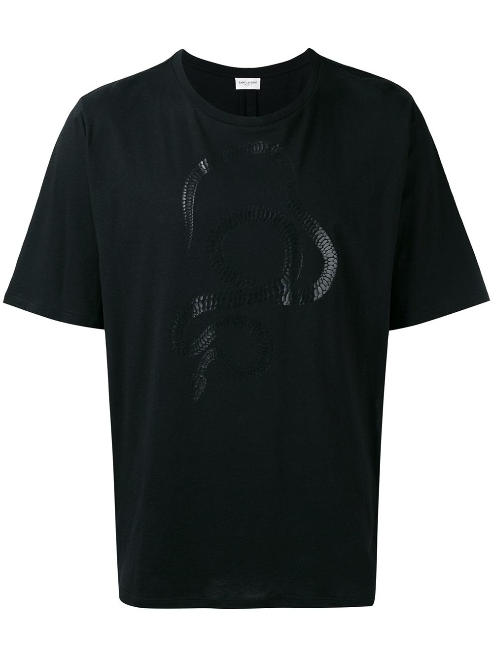 - Under the creative direction of newly appointed Anthony Vaccarello, Saint Laurent’s SS17 collection continues to showcase the label’s coveted rock n’ roll aesthetic, which remains underpinned with a sleek Parisian edge. This black cotton serpent print T-shirt from Saint Laurent features a ribbed round neck, a print to the front, short sleeves, a straight hem and a loose fit.
