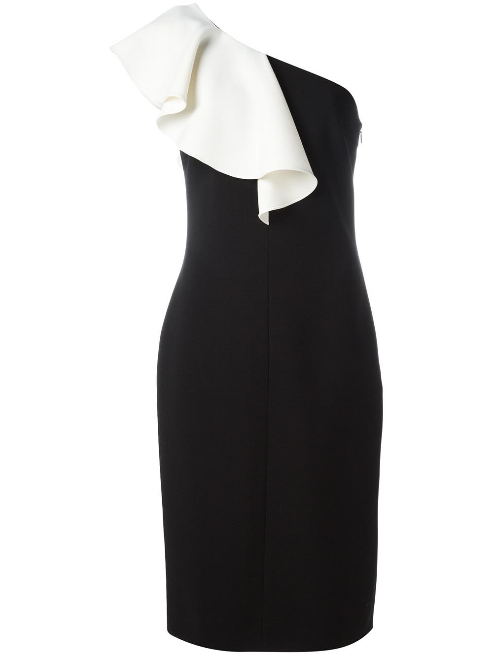 - Saint Laurent (圣罗兰) 黑色与白色 丝绸与初剪羊毛混纺 荷叶边连衣裙。 单肩设计, 侧置隐藏式拉链, 直筒裙式廓形, 中后背开衩, 平直下摆, 中长。