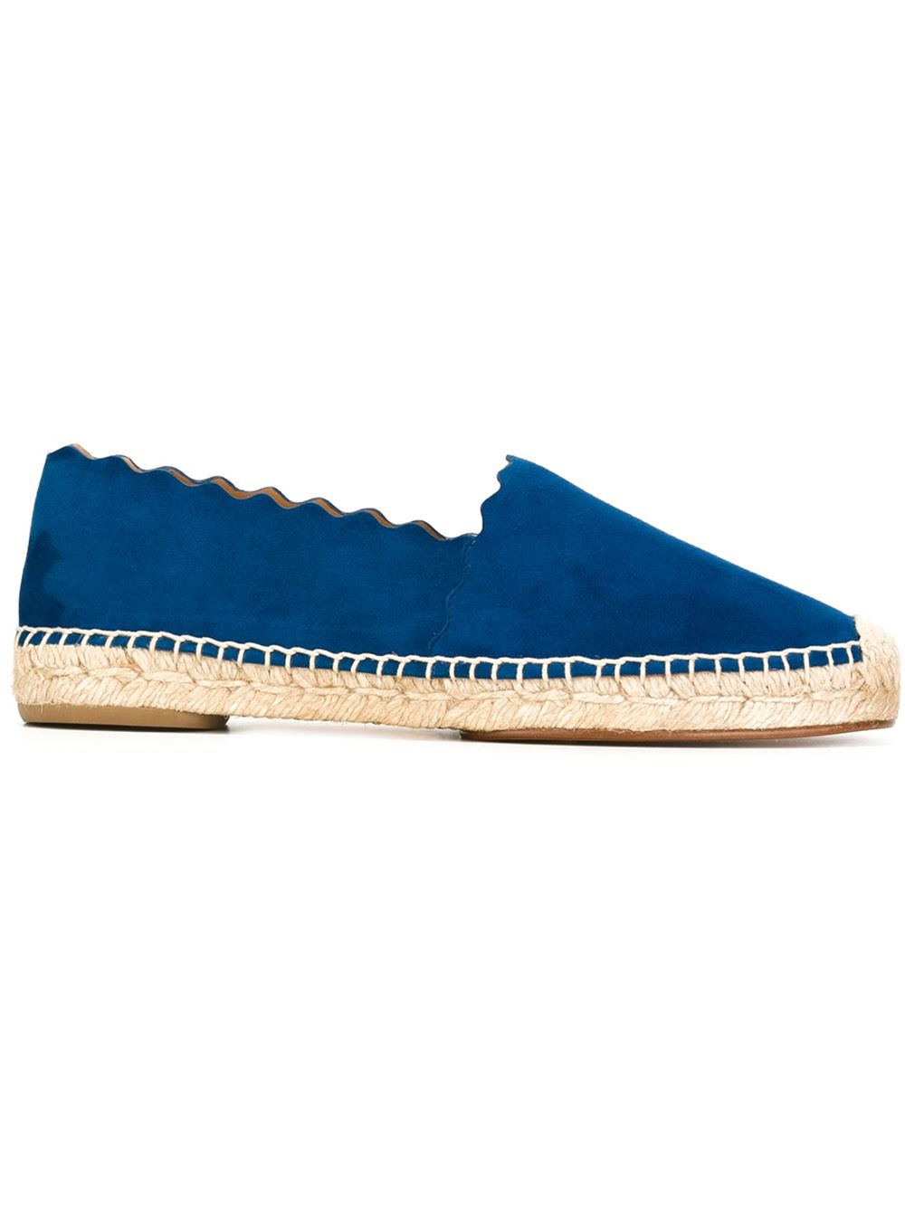 - Chloé 蓝色 牛皮与绒面皮 'Lauren'草编鞋。 杏仁形鞋尖, 鞋垫饰有品牌浮雕, 扇贝形细节, 编织拉菲草质鞋底, 平底。