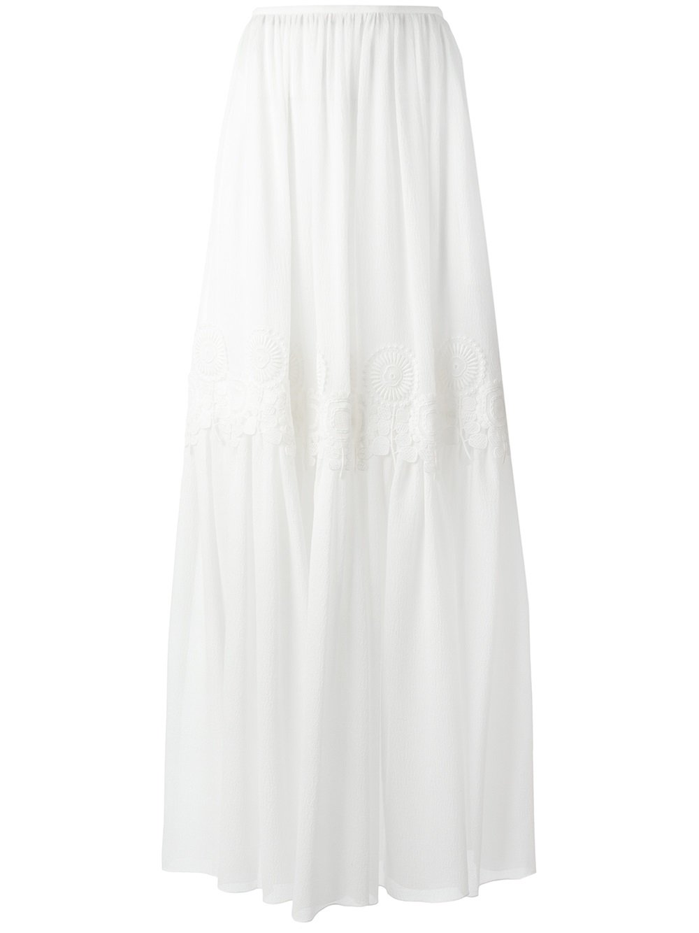 - Chloé (寇依) 白色 丝绸混纺 刺绣缩褶半身裙。 高腰, 缩褶细节, 刺绣细节, 长款, 后置隐形式拉链。