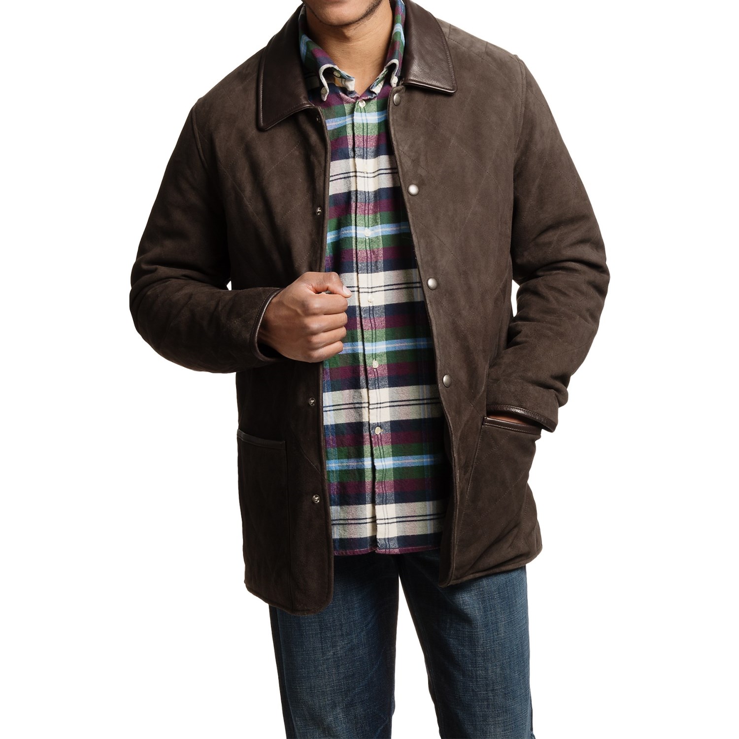 Closeouts. Golden Bear's Hollister jacket reflects the company's legacy of durable, refined outerwear. Thoughtfully crafted of sueded goatskin leather, it has subtle quilting for a contemporary look that's suitable for cold days and long weekend nights.- Golden Bear is a prestigious jacket brand known for its exceptional tailoring and luxurious leathers and suedes
