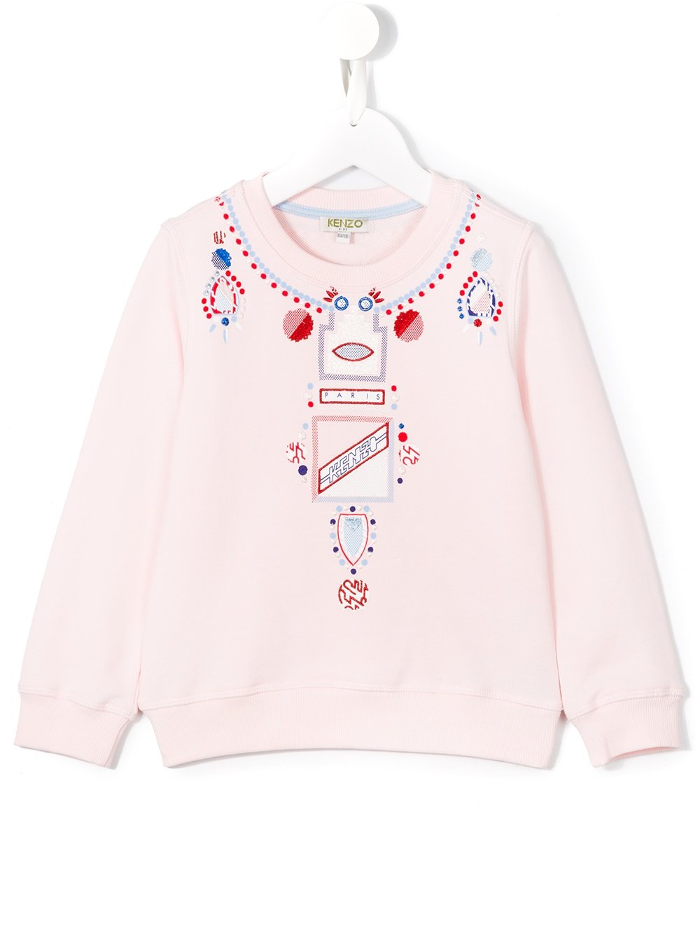 - Cool kids will love the new Kenzo Kids’ collection. Expect lively prints and signature vibrant-hued dresses, T-shirts and sweats. This pink cotton embroidered sweatshirt features a round neck and long sleeves.