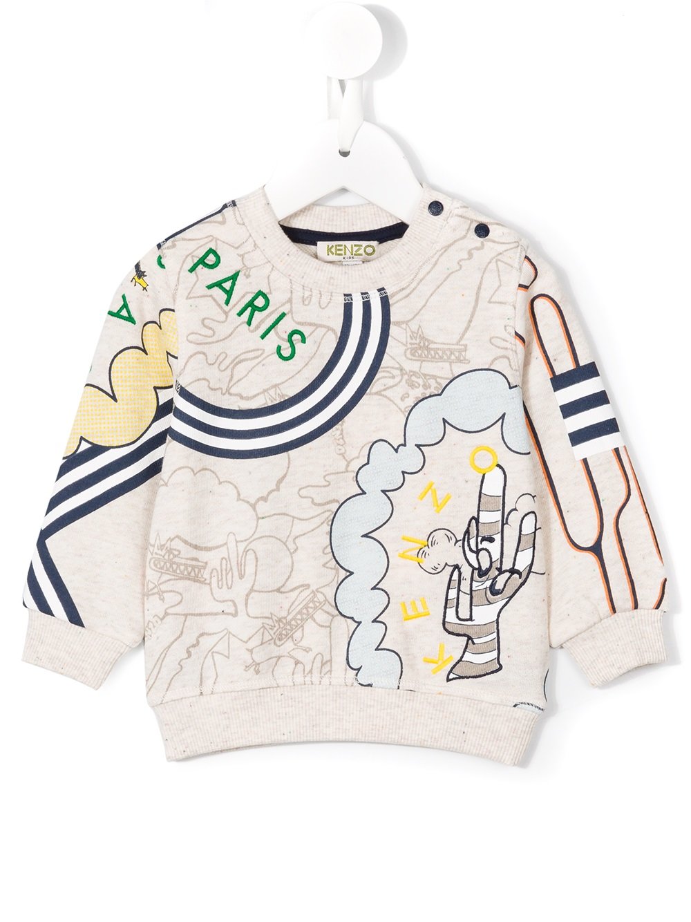 - Cool kids will love the new Kenzo Kids’ collection. Expect lively prints and signature vibrant-hued dresses, T-shirts and sweats. This beige cotton blend logo print sweatshirt features a round neck, buttoned shoulder tabs and long sleeves.