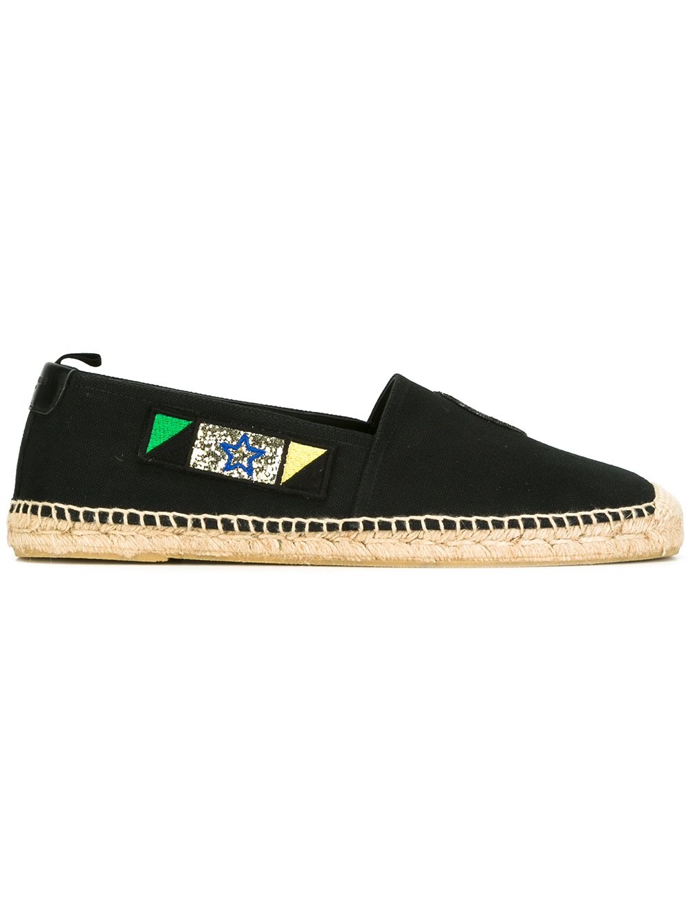 - Saint Laurent (圣罗兰) 黑色与多色 棉质拉菲草牛皮 贴花草编鞋。 圆头, 鞋垫饰有品牌浮雕, 穿套式, 平底橡胶鞋底。