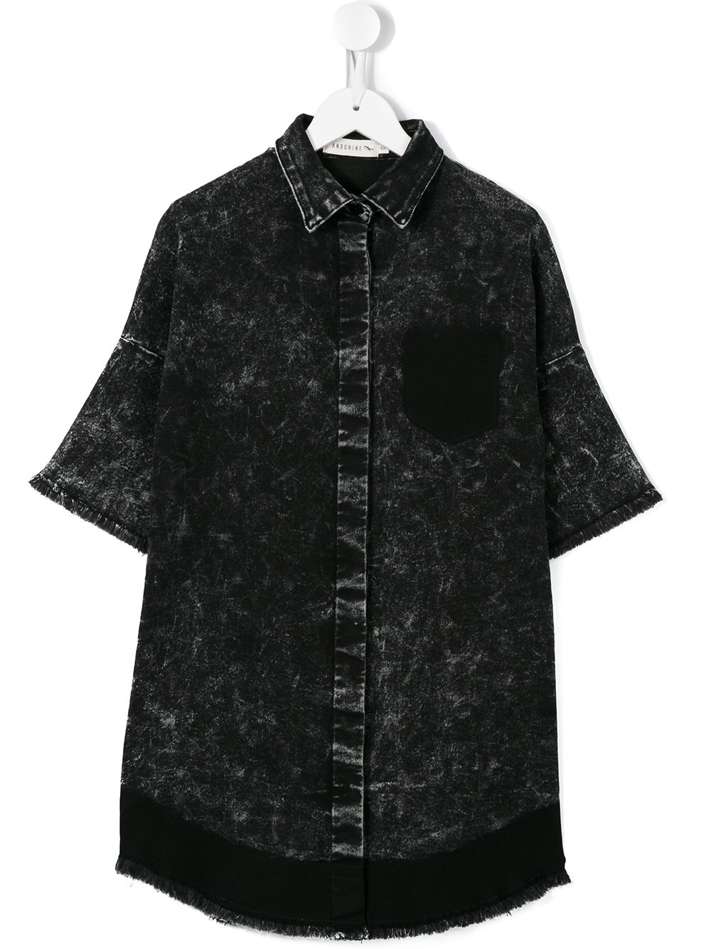 - Andorine 水洗黑色 弹性棉质 磨损边衬衫式连衣裙。