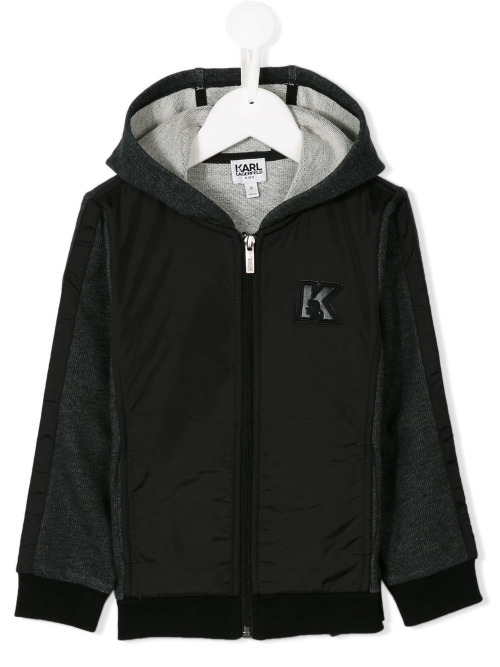 - Black and grey cotton zipped hoodie from Karl Lagerfeld Kids featuring a hood, a front zip fastening, a logo to the chest, long sleeves and a straight hem.
