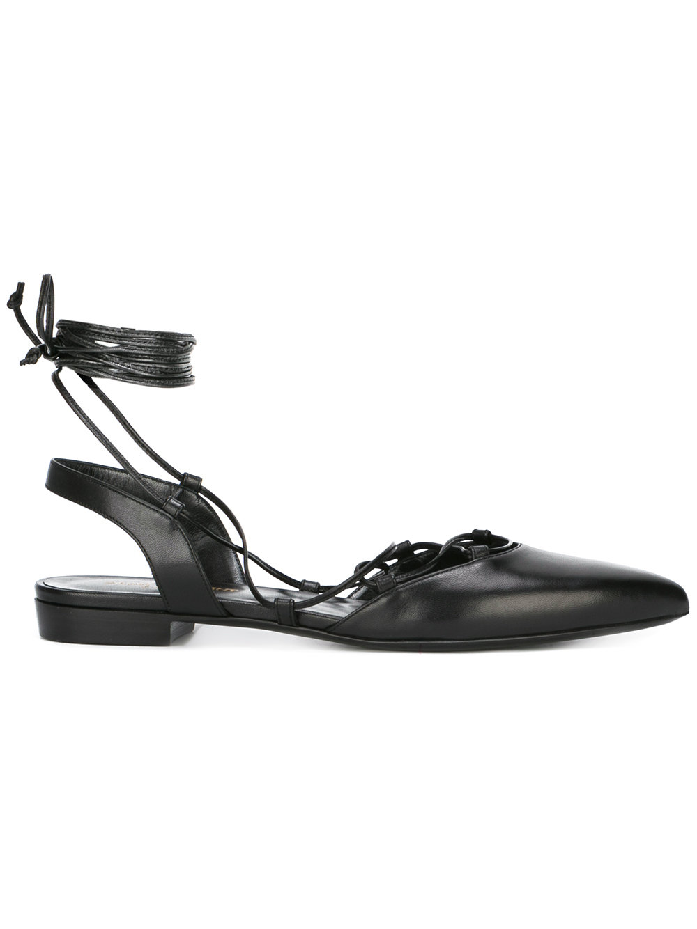 - These black Paris SK ballerinas have been realised in smooth black leather and feature a pointed toe and delicate crossover strap lace-up fastening. Embossed with Saint Laurent's logo to the insole, these elegant ballerinas are finished with a low heel and slingback strap.
