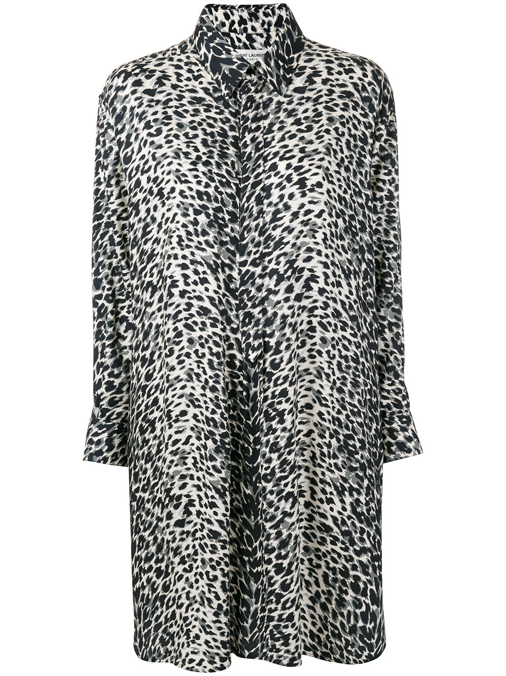 - Invest in Anthony Vaccarello’s new season vision for SS17. Continuing on from Hedi Slimane, this grey, black and white leopard print shirt dress is instilled with the label’s coveted rock n’ roll aesthetic. Designed with a classic collar, a front button fastening, long sleeves with button cuffs and a curved hemline; style yours with one of Saint Laurent’s black leather biker jackets and a pair of Rock 40 cowboy boots.