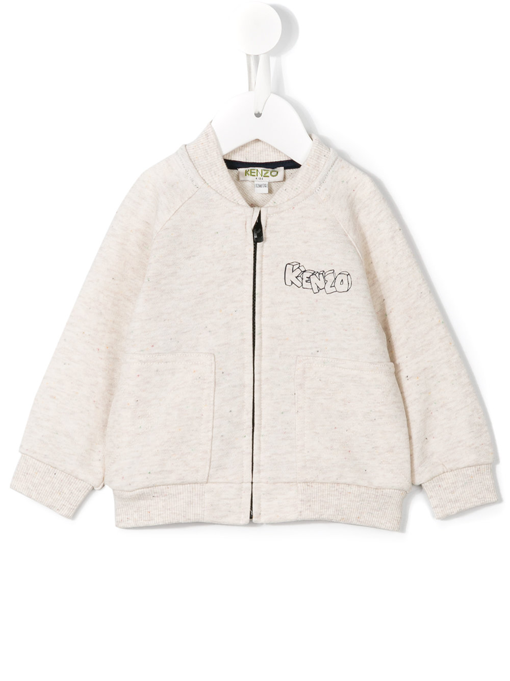 - Cool kids will love the new Kenzo Kids’ collection. Expect lively prints and signature vibrant-hued dresses, T-shirts and sweats. This nude cotton zipped bomber jacket features a high standing collar, a front zip fastening, a logo to the chest, two front pockets, long sleeves, a print to the rear and a ribbed hem and cuffs.