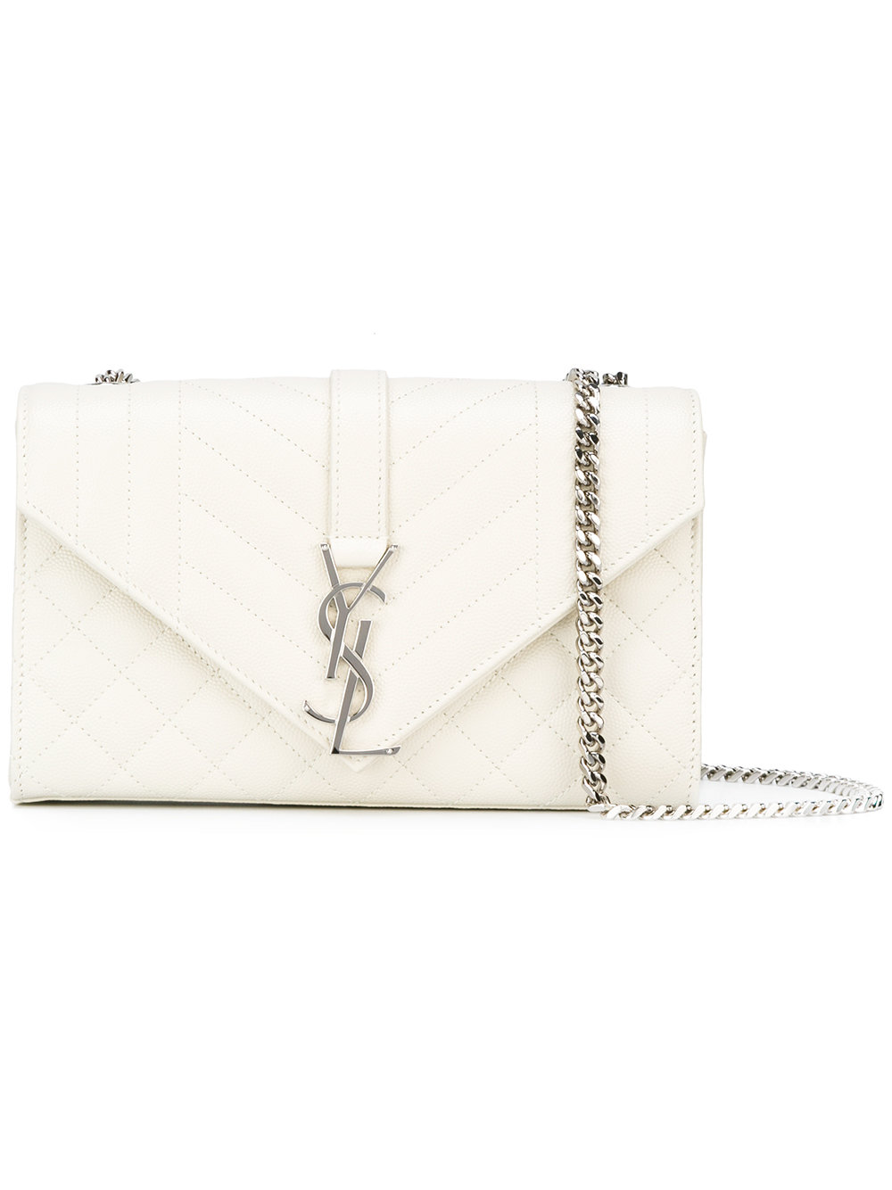 - First designed in 1961, Saint Laurent’s intertwining YSL logo is one of the French fashion house’s most revered and iconic. Presented here in silver-tone hardware atop the label’s small Monogram satchel, it beautifully accents the white mixed matelassé leather construction. Expertly made in Italy to Saint Laurent’s exacting standards, this everyday satchel bag is designed with a magnetic closure, internal slip pocket and a chain and leather shoulder strap. Pair yours with the label’s skinny fit distressed denim and pointed toe stiletto pumps for an everyday look with a rock ‘n’ roll edge.