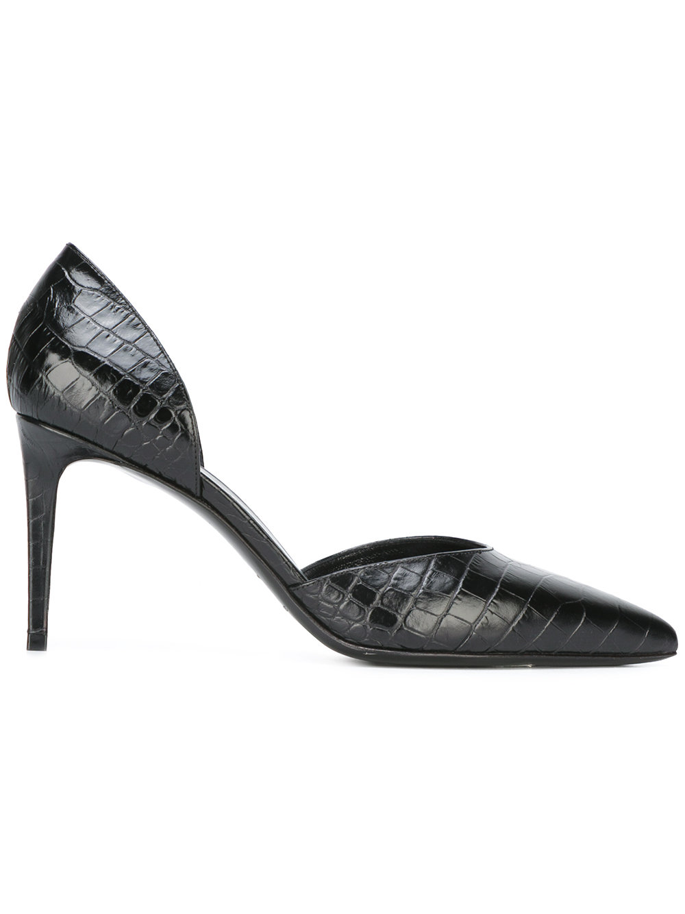 - Constructed in crocodile embossed black leather, Saint Laurent’s Paris 80 D’Orsay pumps are an updated take on a classic. Presented with an easy-to-wear stiletto heel, they feature a classic pointed toe, a Saint Laurent embossed insole, an elegant slip-on style and decorative cut-out detailing.