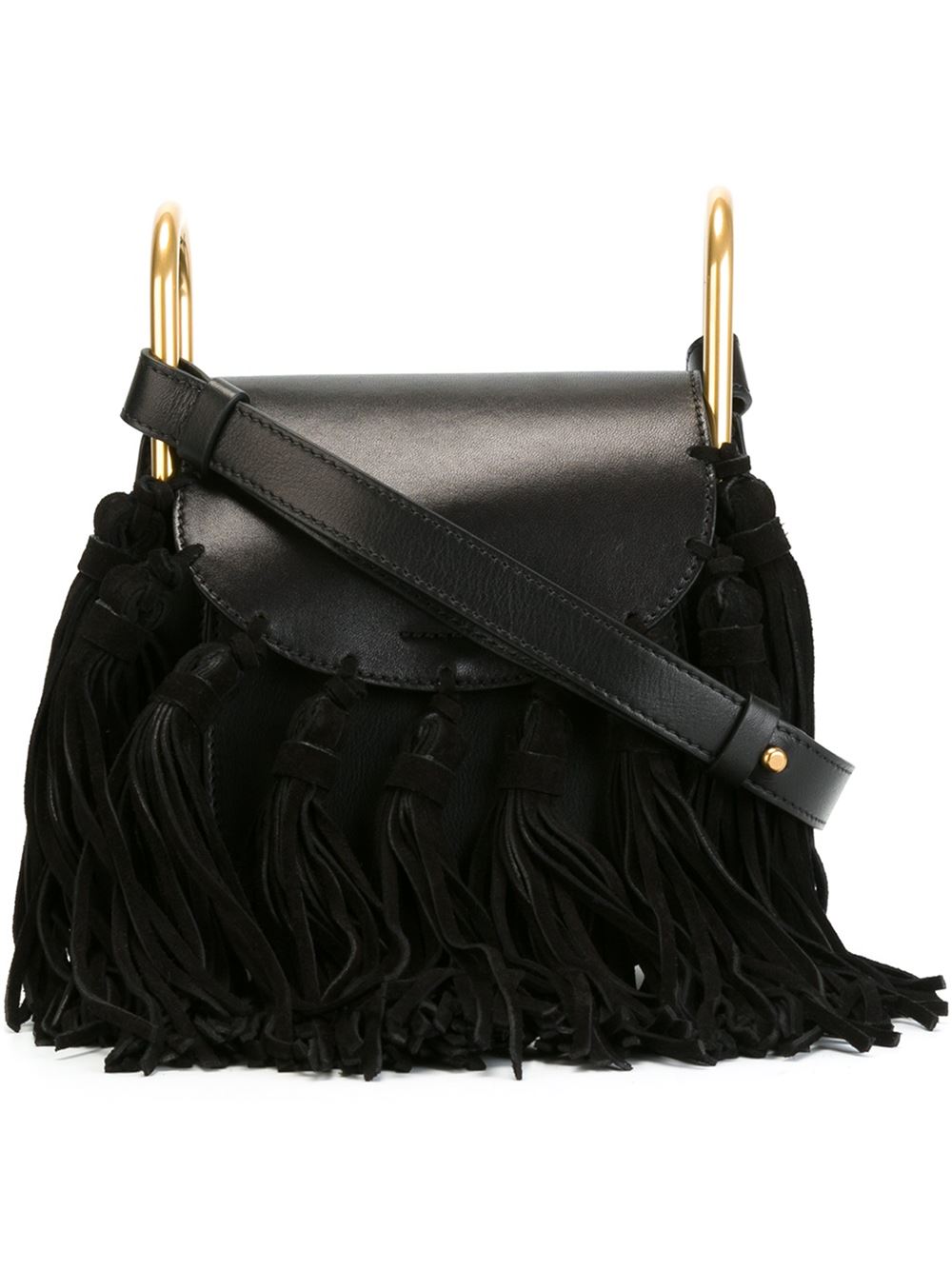 - Chloé 黑色 绒面皮 'Hudson'流苏斜挎包。 翻盖饰有插入式的摁扣, 浮雕标志, 内置多个分层, 金色五金配件, 可调整肩带, 绒面皮内里。