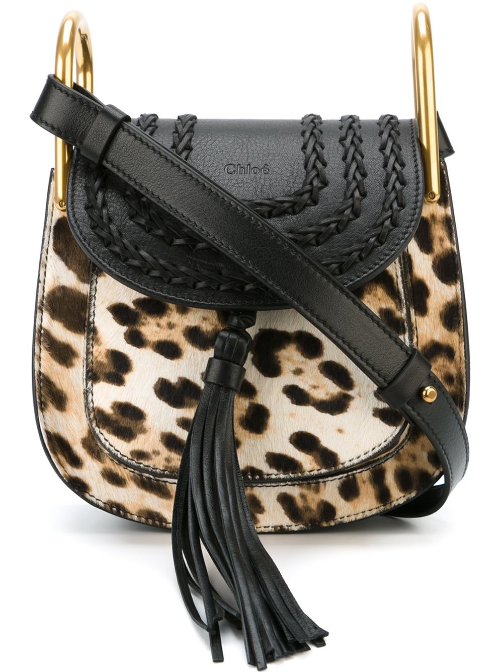 - Chloé 黑色与白色 小牛皮小牛皮毛绒面皮 'Hudson'豹纹单肩包。 翻盖饰有摁扣, 正面饰有浮雕品牌标记, 金色五金配件, 豹纹, 内置多个分层。